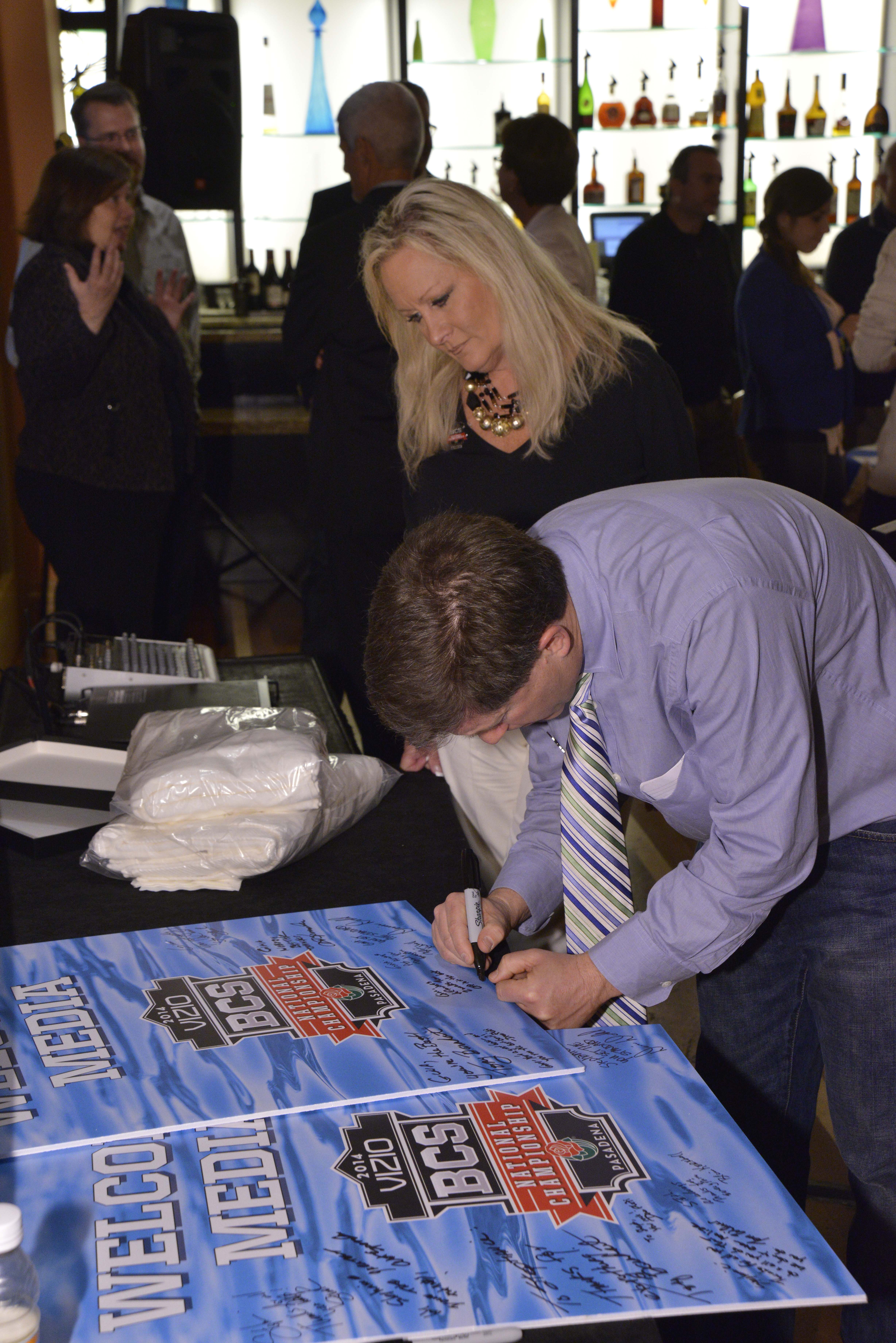 After the breakfast, Jon Wilner signed one of two appreciation posters the FWAA gave to Gina Lehe and Stephanie Montano of the Rose Bowl in appreciation for their service to the media during the Rose Bowl and the Bowl Championship Series title game. (Photo courtesy of Rose Bowl)
