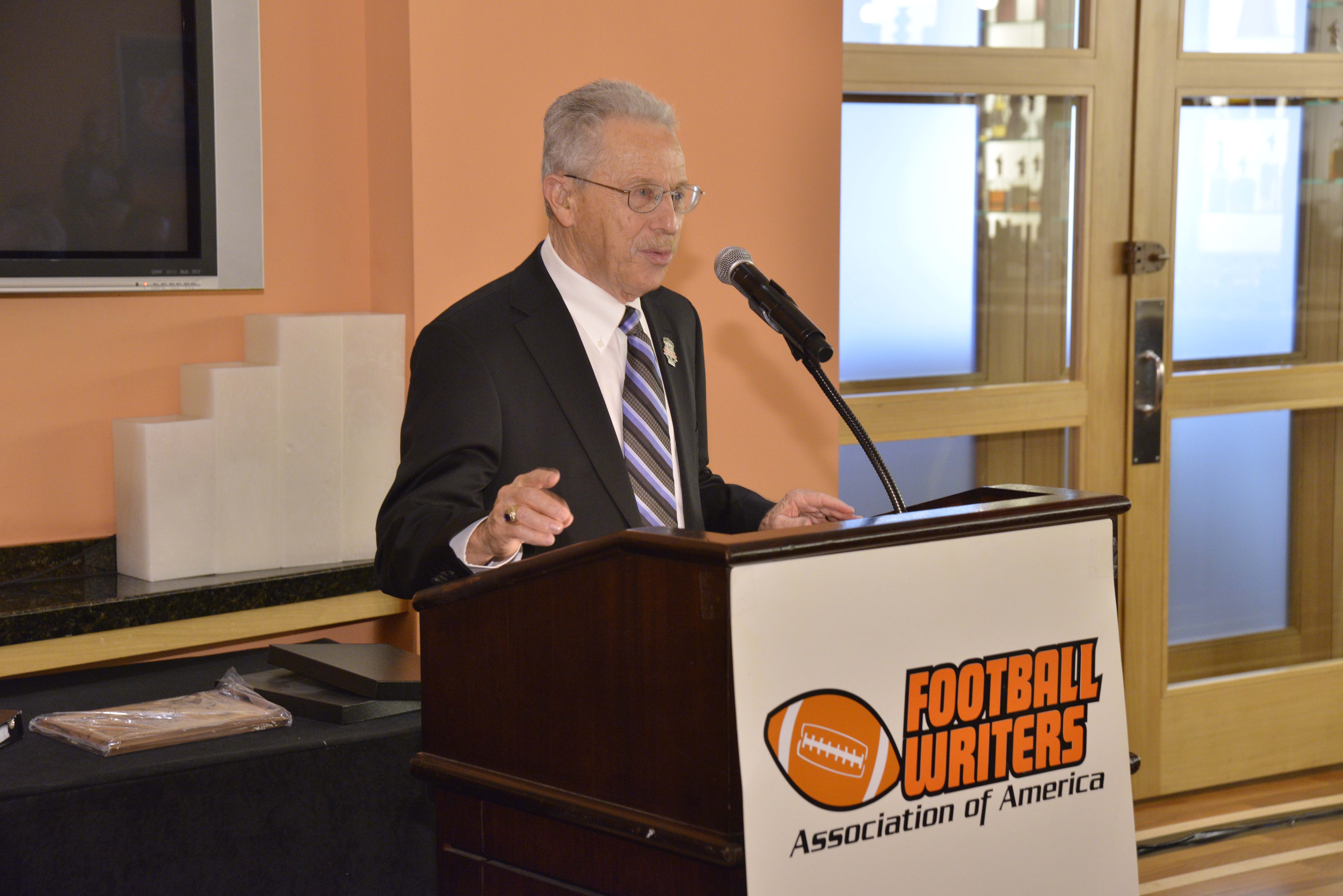 Art Spander accepted the FWAA’s Lifetime Achievement Award. He earlier was honored in the Rose Bowl Press Box. (Photo courtesy of Rose Bowl)